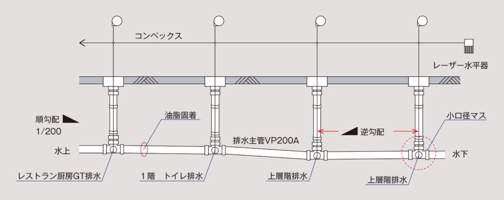 その内視鏡検査では配管内部に障害物を確認できなかったが、内視鏡が水没した状況が確認できたため、逆勾配の可能性があると判断して配管レベルの調査を実施しました。