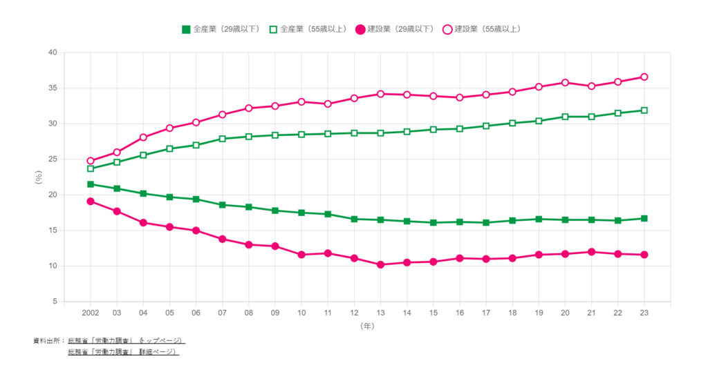 2024年4月1日より「時間外労働の上限規制」が適用された建設業。(一社)日本建設業連合会「建設業デジタルハンドブック」の「建設業就業者の高齢化の進行」によると、建設業の就業者は2022年に55歳以上が約36%を占め、29歳以下は約12%と、全産業と比べて高齢化が著しく上昇していることがわかります(図1)。この傾向は今後も続くことが予想されるため、現状で「月45時間、年360時間」の条件をクリアできていても、さらなる対策が求められるのかもしれません。