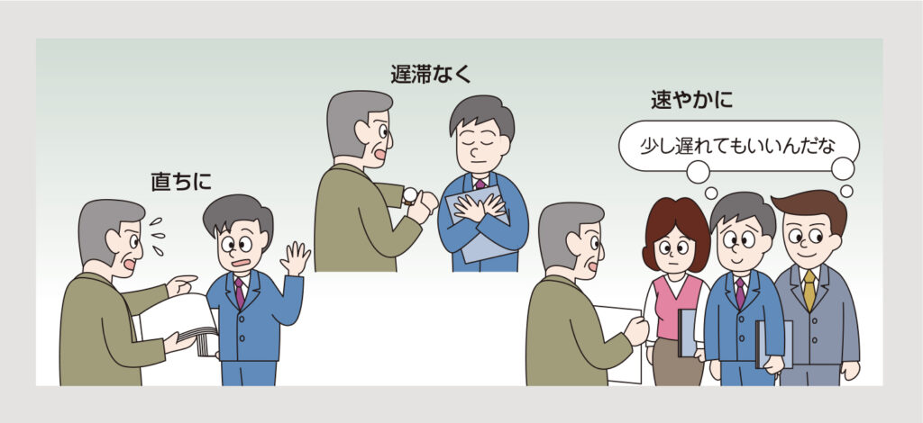 「直ちに」は「何をおいても、すぐ」という意味で、時間的な即効性が非常に強い場合に使う。「遅滞なく」は時間的な即時性は強いが、正当な、または合理的な理由であれば、すぐに行わなくても構わない場合に用いる。「できるだけ早く」という意味である。