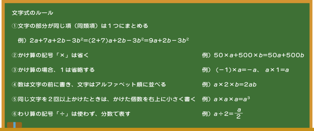 先生 わからなくなったら、具体的な数字に置き換えて考えてみるといいよ。さて、文字式のルールを黒板にまとめてみたから確認してみようか。