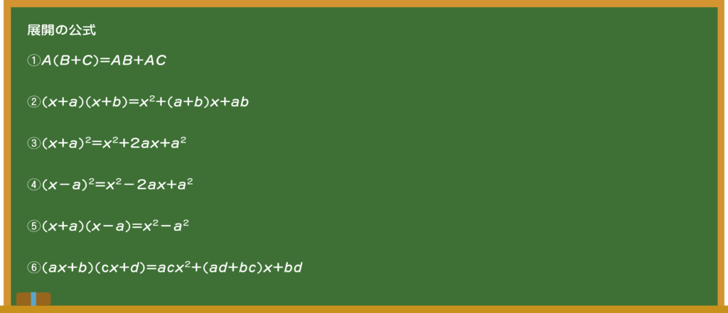 先生 分配の法則を使って式のカッコを外してきたけど、この計算のことを「式を展開する」というんだ。展開の公式を覚えておけば、分配の法則のように手間の多いプロセスを踏まないで、すぐに解答が求められるよ。