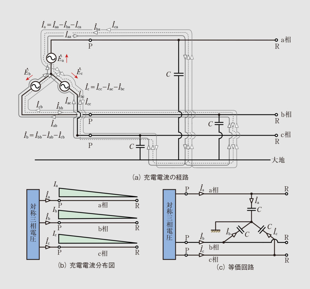 図1(a)からわかるように、三相3線式配電線路に流れる充電電流は各相の電源と対地静電容量が複雑に関係している。 例えば、充電電流 I ˙ a は電源 E ˙ a から出ていく I ˙ aa 、大地から電源 E ˙ a に向かう I ˙ ba 、 I ˙ ca から構成されている。 したがって、充電電流 I ˙ a は次式で表すことができる。 I ˙ a = I ˙ aa − I ˙ ba − I ˙ ca ……(1) 充電電流 I ˙ b 、 I ˙ c においても同様の式が成り立つ。 I ˙ b = I ˙ bb − I ˙ ab − I ˙ cb ……(2) I ˙ c = I ˙ cc − I ˙ ac − I ˙ bc ……(3) また、充電電流 I ˙ aa はa相の対地静電容量を通り、大地へ流れて I ˙ ab と I ˙ ac に分かれ、 I ˙ ab は「b相対地静電容量→b相配電線路→b相電源→a相電源」の経路を、 I ˙ ac は「c相対地静電容量→c相配電線路→c相電源→a相電源」の経路を、それぞれだどる。 このように、電源 E ˙ a から流れる充電電流はb相、c相の充電電流にも影響を与えていることがわかる。これは充電電流 I ˙ bb 、 I ˙ cc についても同様である。 充電電流 I ˙ bb はb相の対地静電容量を通り、大地へ流れて I ˙ ba と I ˙ bc に分かれ、 I ˙ ba は「a相対地静電容量→a相配電線路→a相電源→b相電源」の経路を、 I ˙ bc は「c相対地静電容量→c相配電線路→c相電源→b相電源」の経路を、それぞれだどる。 また、充電電流 I ˙ cc はc相の対地静電容量を通り、大地へ流れて I ˙ ca と I ˙ cb に分かれ、 I ˙ ca は「a相対地静電容量→a相配電線路→a相電源→c相電源」の経路を、 I ˙ cb は「b相対地静電容量→b相配電線路→b相電源→c相電源」の経路を、それぞれだどる。