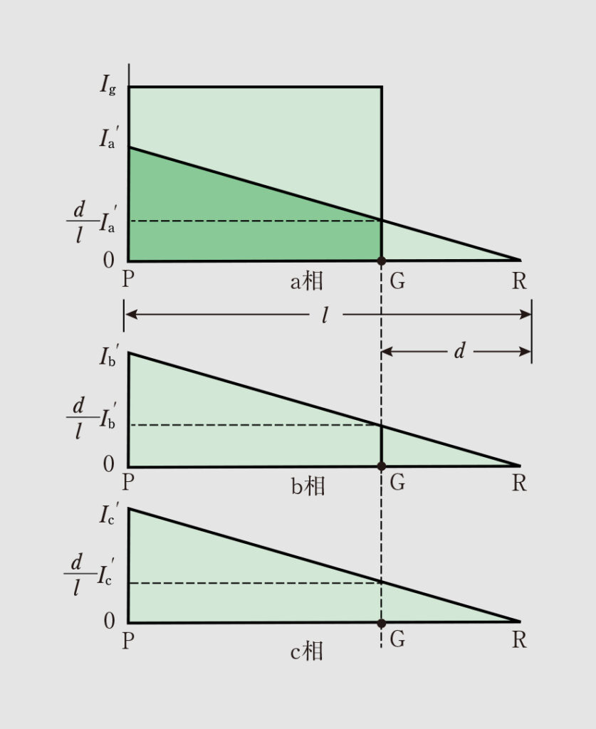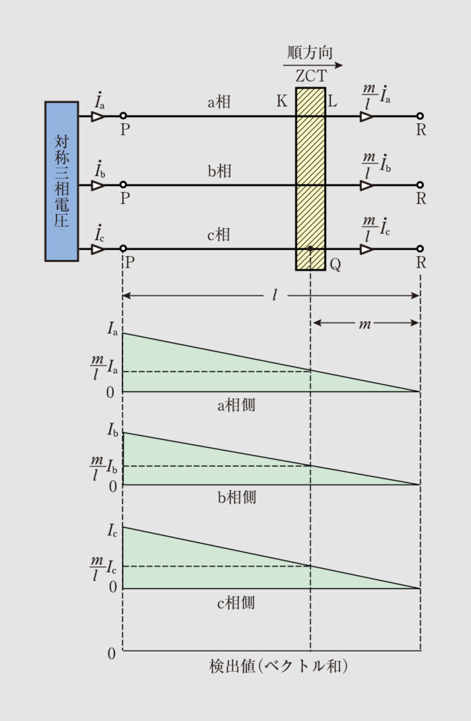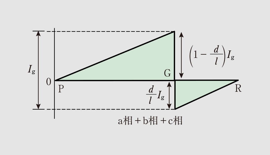 ・Q点がPG間にある場合(d≦m≦l) この場合、各相の電流は順方向なので、 m l I ˙ a ′ + I ˙ g + m l I ˙ b ′ + m l I ˙ c ′ = m l ( I ˙ a ′ + I ˙ b ′ + I ˙ c ′ ) + I ˙ g = − m l I ˙ g + I ˙ g = ( 1 − m l ) I ˙ g となる。 ・Q点がGR間にある場合(0≦m≦d) この場合も各相の電流は順方向なので、 m l I ˙ a ′ + m l I ˙ b ′ + m l I ˙ c ′ = m l ( I ˙ a ′ + I ˙ b ′ + I ˙ c ′ ) = − m l I ˙ g となる。 以上から、ZCTが検出する地絡電流の分布図は図7となり、三相でも単相でも同じ結果となる。すなわち、以下のことがいえる。 ・ZCTは地絡電流のみを検出する。 ・地絡点Gに近いほど、検出される地絡電流は大きくなる。 ・検出した地絡電流は、地絡点GとZCTの設置位置Qの関係により順方向(縦軸上方)か逆方向(縦軸下方)の方向性がある。つまり、電源側から地絡点へ向かう電流、負荷端から地絡点へ向かう電流がある。