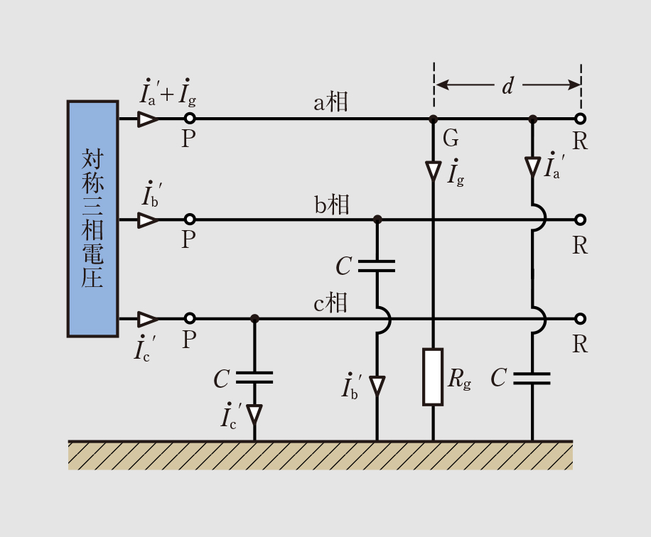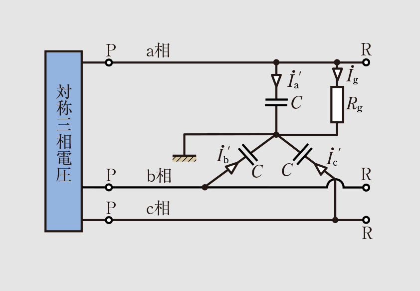 非接地式三相3線式配電線路の地絡 三相3線の場合も単相と同様に考えることができる。 図4は図1(a)のa相のG点で地絡したもので、各相の充電電流を I ˙ a ′ 、 I ˙ b ′ 、 I ˙ c ′ 、地絡電流を I ˙ g とすると、その等価回路は図5となり、各相の充電電流の分布図は図6のようになる。図5から、 ( I ˙ a ′ + I ˙ g ) + I ˙ b ′ + I ˙ c ′ = 0 I ˙ a ′ + I ˙ b ′ + I ˙ c ′ = − I ˙ g が成立するので、PG間、GR間に分けて算出する。