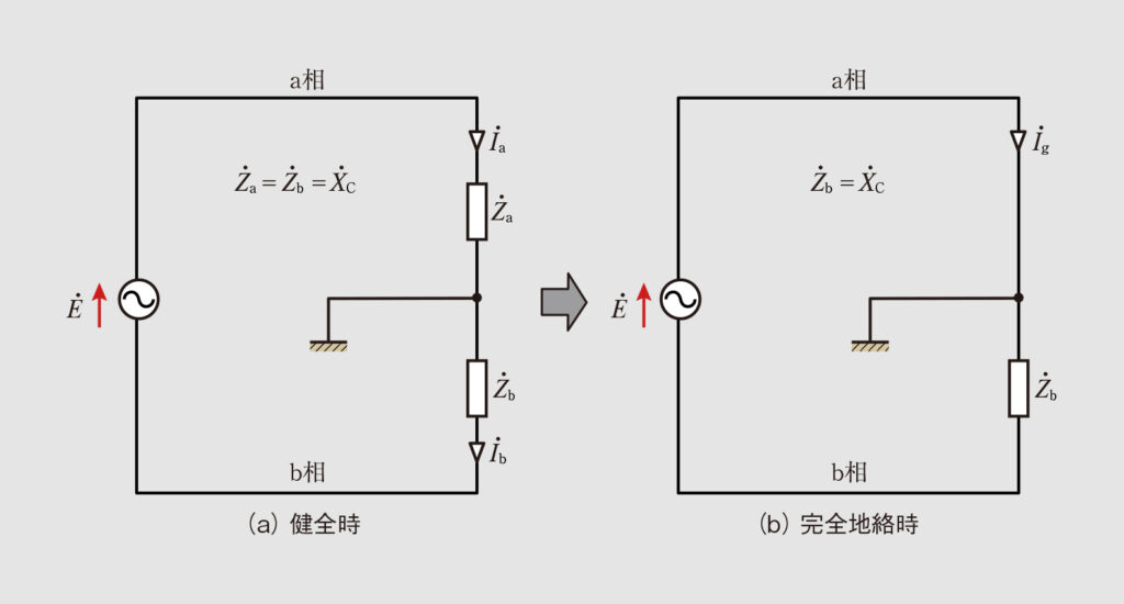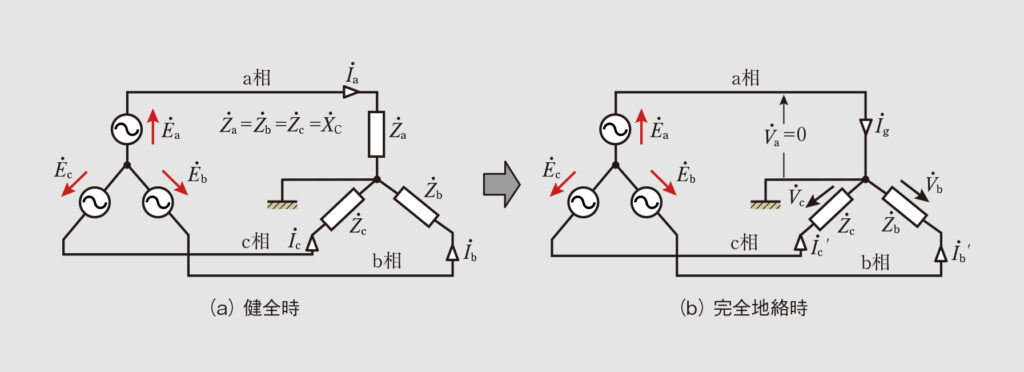 ・完全地絡時の地絡電流 I ˙ g 地絡した相が直接大地に接触すると、 R g =0となって完全地絡となり、地絡した相の電位は大地と同等となって対地静電容量は0となる。このときの地絡点に流れる地絡電流 I ˙ g は Z ˙ a =0、 Z ˙ b = X ˙ C のみの単相回路なので次式となる。 I ˙ g = E ˙ X ˙ C = 2 × E ˙ 2 X ˙ C = 2 I ˙ a 以上から、完全地絡時の地絡電流 I ˙ g は、健全時の1相あたりの充電電流 I ˙ a の2倍の電流が流れることがわかる。 (b)三相3線式の場合 ・健全時の1相あたりの充電電流 I ˙ a 各相電圧を E ˙ a 、 E ˙ b 、 E ˙ c 、健全時における1相あたりの全対地静電容量Cのリアクタンスを X ˙ C とすると、a相の充電電流 I ˙ a は図9より次式となる。 I ˙ a = E ˙ a X ˙ C