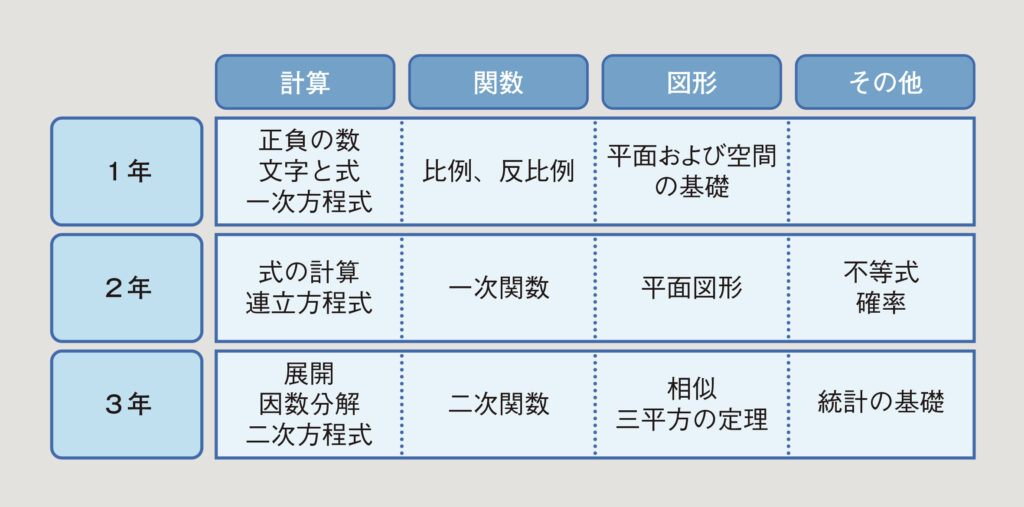 中学で学習してきた数学の範囲は、年齢によって多少の差はあるものの、だいたい図1に示すとおりだろう。意外にも、中学の時点で基礎的な数学を学習していたことがわかる。