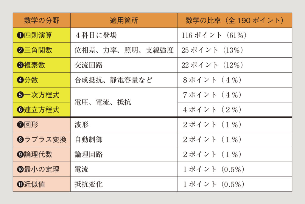 例えば、2024年度下期(2025年3月23日)の受験を考えた場合、本試験は約4カ月後に迫っているため、数学の学習に割ける時間は多くはない。効率よく数学力を身につけるには過去の出題問題(表1)で必要な数学の分野を把握することが最良の方法となる。