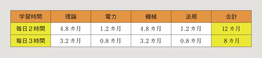 電験三種の学習に真正面から取り組むと、1カ月に25日間の学習をしたとして、その月数の試算は1日2時間の学習で20カ月、3時間の学習で約13カ月となる。