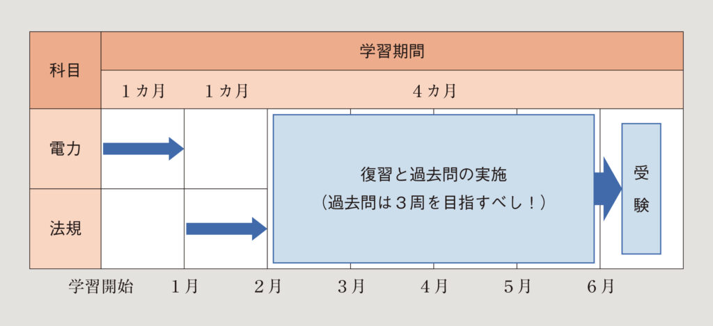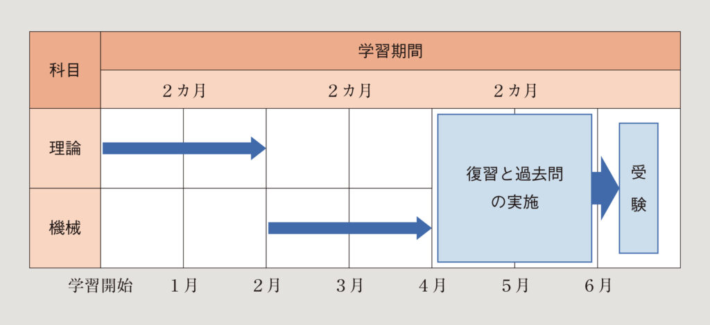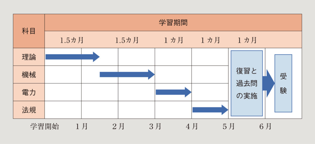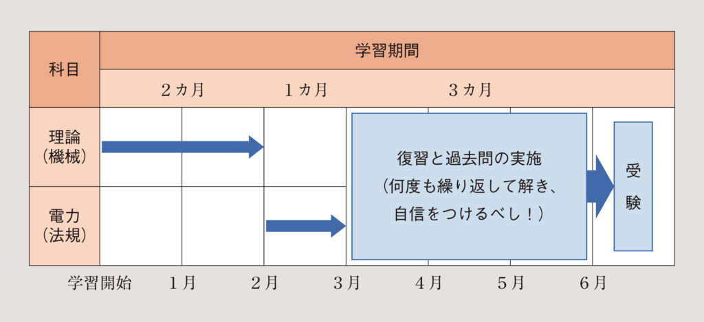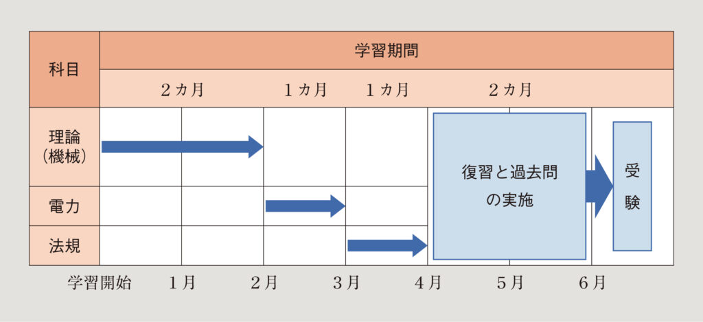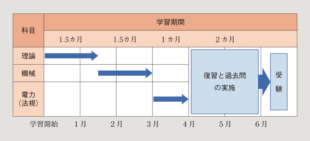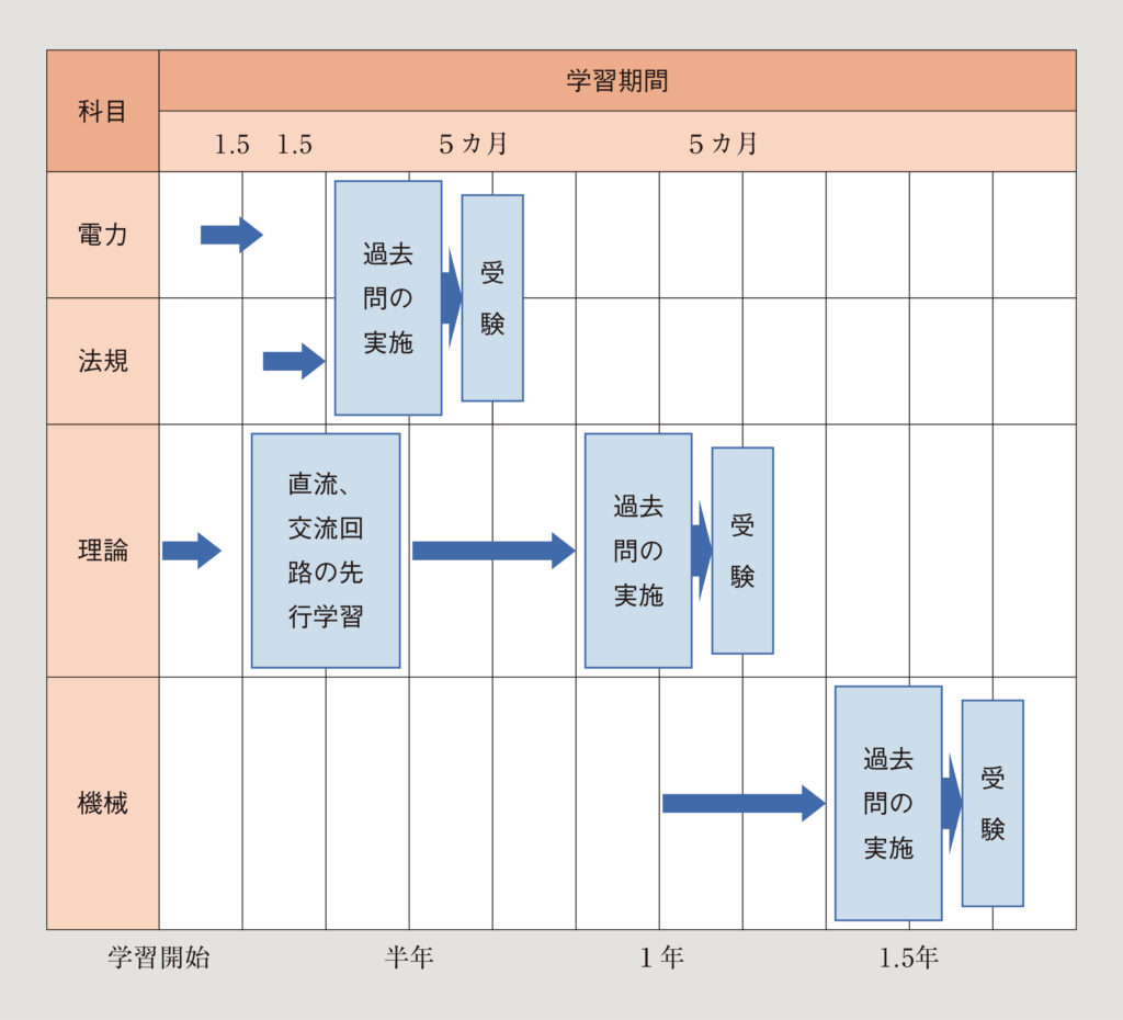 じっくり時間をかけて学習するタイプの場合、理論、機械、電力、法規の順番で学習すると効率がいい。毎日2時間の学習に取り組んだとして、2年間で作成した学習計画を表1に示す。長丁場となるため、しっかりした信念を持って進めていく必要がある。この場合、力試しに途中で受験してみるのも手だ。