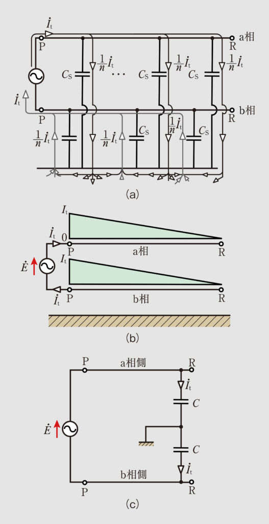 前回は地絡現象における基礎的なことを中心に解説した。さて、今回は単相2線式配電線路における地絡現象を取り上げる。 図1(a)は配電線を平行に配線した非接地式単相2線式配電線路を、一様に分布する対地静電容量をn個のコンデンサで表したものである。R点側は開放で無負荷だが、両相の対地静電容量により充電電流は「電源~a相側配電線路~a相側対地静電容量~大地~b相側対地静電容量~b相側配電線路~電源」の経路を流れる。
