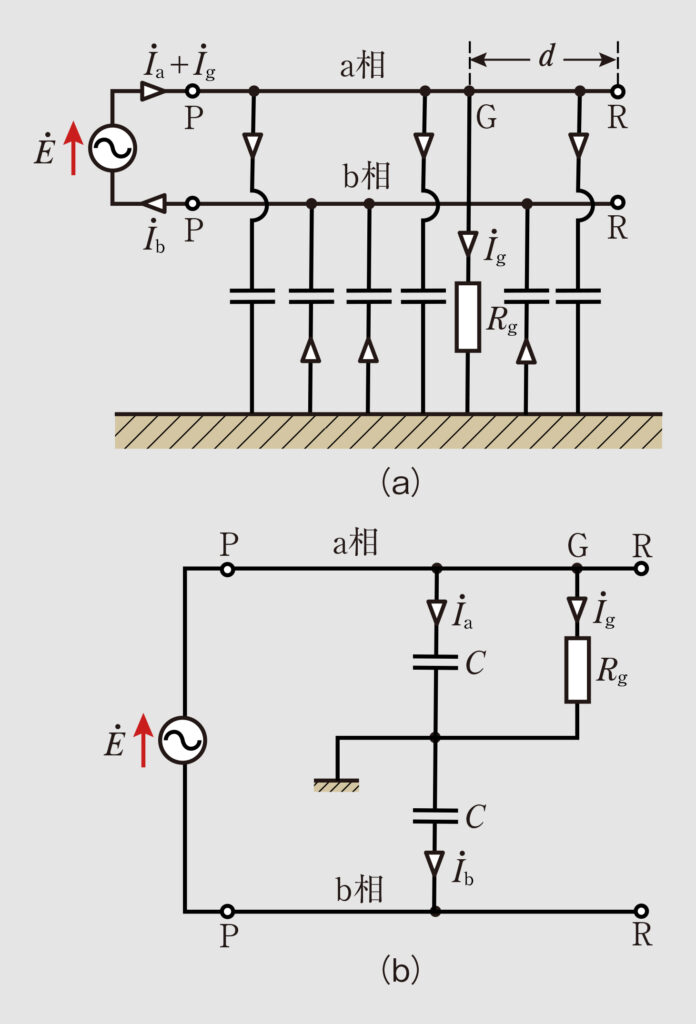 図4(a)は図1(a)においてa相のG点で地絡したものである。GR間をd[km]とすると、その等価回路は図4(b)になる。 ここで、a相側の充電電流を I ˙ a 、地絡電流を I ˙ g 、b相側の充電電流を I ˙ b として、それぞれの方向を図4(b)のようにとると、 I ˙ a + I ˙ g = I ˙ b となる。