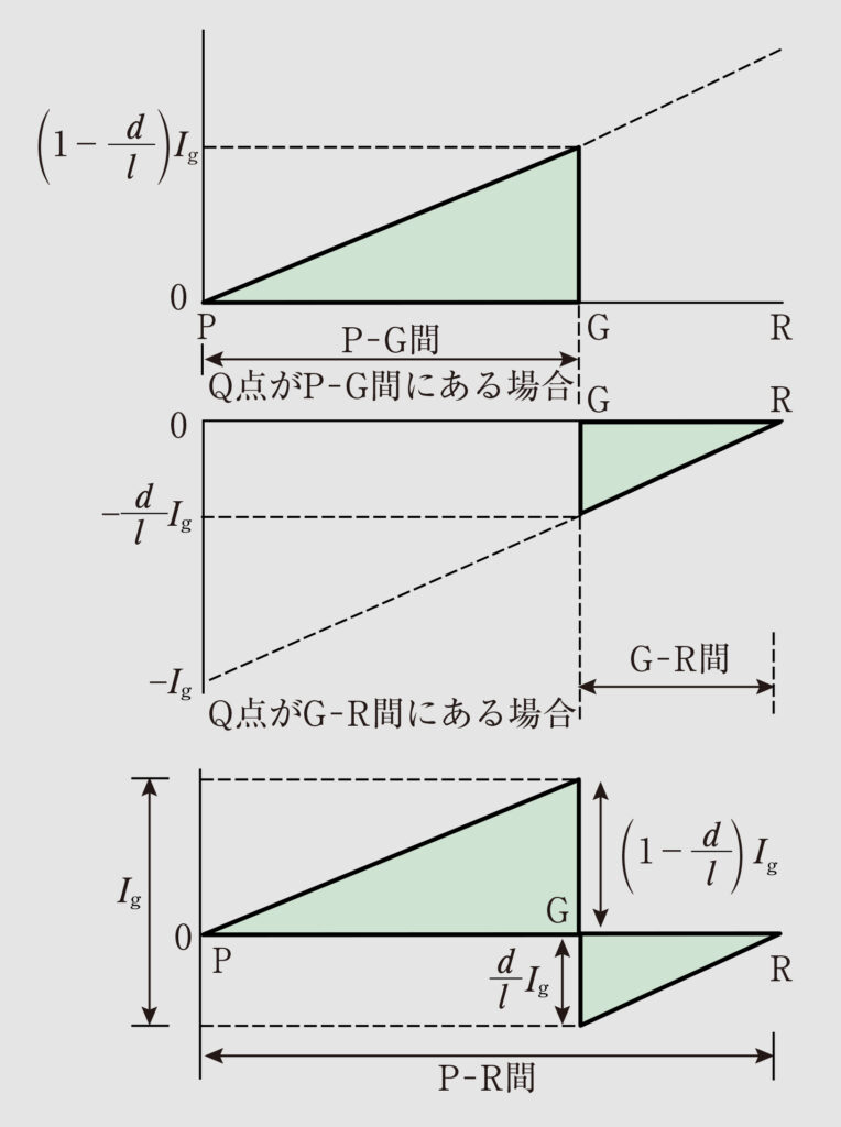 地絡電流 I ˙ g は「電源~a相側配電線のPG間~地絡抵抗 R g ~大地~b相側対地静電容量(b相側の充電電流に含まれる)~b相側配電線路~電源」と流れるので、両相の充電電流、地絡電流の分布図は図5のようになる。 なお、地絡電流 I ˙ g は前述のように地絡抵抗 R g を流れる電流なので、図5のように一定の大きさとなる。 図5において、ZCTを設置する任意の点Qにより検出される電流値がどのようになるか、PG間、GR間に分けて算出してみる。ただし、第1回の図4(c)および図2と同様、Q点はPR間を移動し、QR間をm[km](0≦m≦l)とする。また、地絡点Gは移動しないものとする(dは定数)。