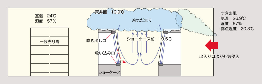 現地を確認したところ、カビが発生している天井は冷蔵ショーケースが設置されているエリアの上部でした。ショーケースはオープンタイプと呼ばれるもので、5~6段の棚に商品が置かれ、前面上部から冷気が吹き出し、下部から冷気を吸い込むエアカーテン効果によって商品の温度を一定に維持している構造です。