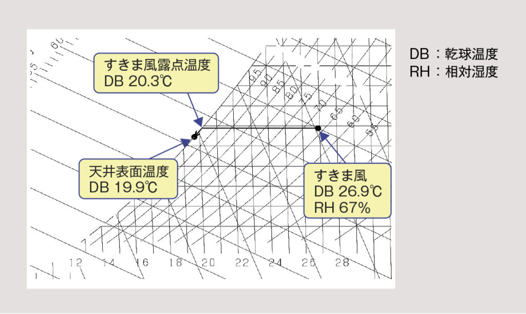 これらの影響から天井面まで低温度になり、天井ボードの温度が周囲空気の露点温度以下になったときに結露が生じ、カビが発生するものと推測しました(図2)。