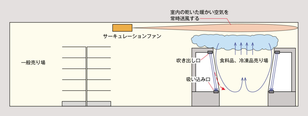 家電機器メーカーの小型のサーキュレーションファンがありますが、これを利用して一般売り場の温度の高い空気をオープンショーケース設置エリアの上部に向けて吹きつけることで冷気を遮断して天井ボードの温度低下を防ぎ、同時に空気を撹拌することで通路の不快なコールドドラフトの軽減も期待できます(図3)。