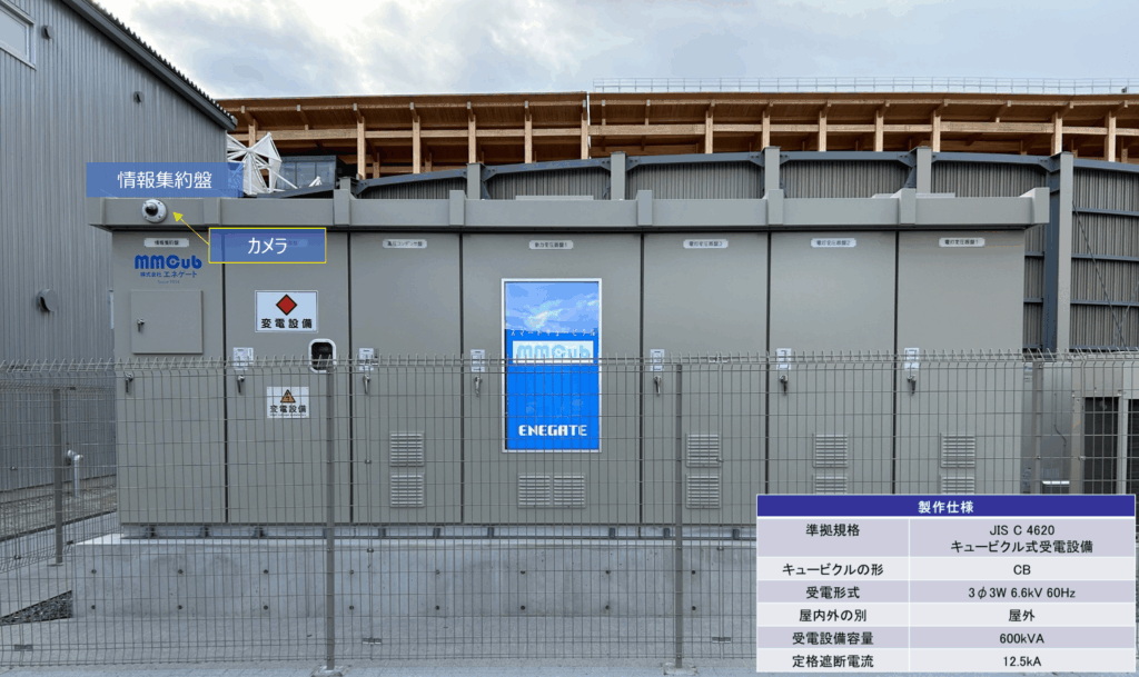 スマートグリッド実証用のキュービクルに到着。太陽光発電システムやHEMS、V2Hなど、さまざまなDXを活用したスマートシステムを実証する「スマートグリッド」の電力を司る設備で、施設の性格上、このキュービクルに内蔵した6kV/6kV絶縁変圧器を介して負荷側の系統は独立させ、架空2回線常開ループ系統としている。