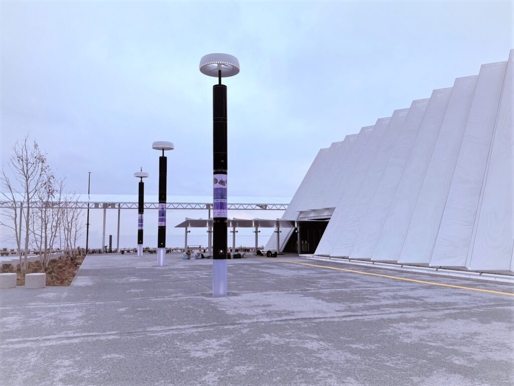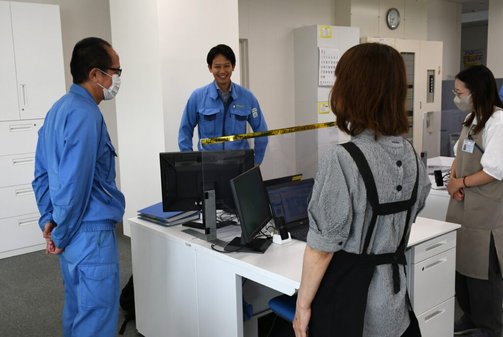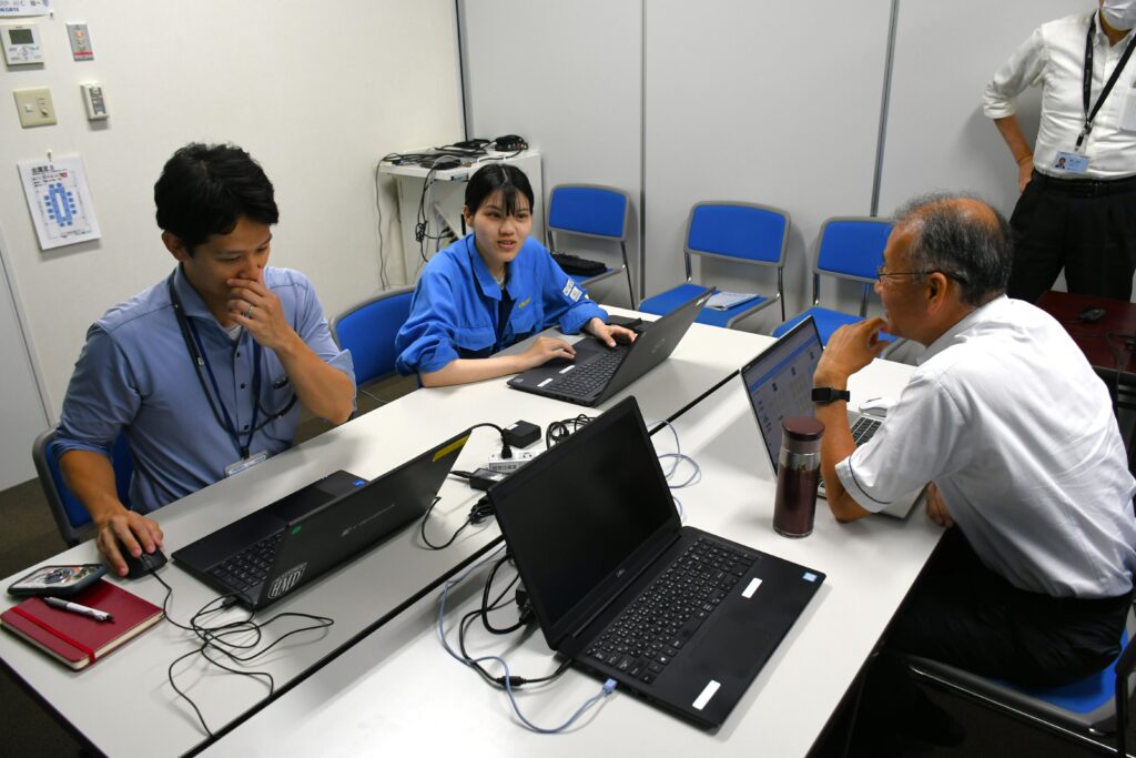 別室でミーティングに参加。大阪・関西万博のパビリオンに導入している、スマート保安を実現する最新キュービクル「MMCub」(電力館)や、最先端のディジタルシステムを搭載した多機能ポール「スマートポール」(電力館、未来の都市)の状態について報告する。これらは量産モデルにするための実証試験も兼ねて設置され、2週間に1度、現地で機能チェックを行っているという。