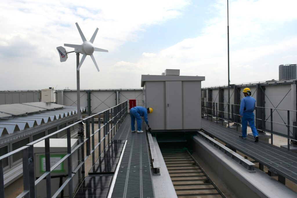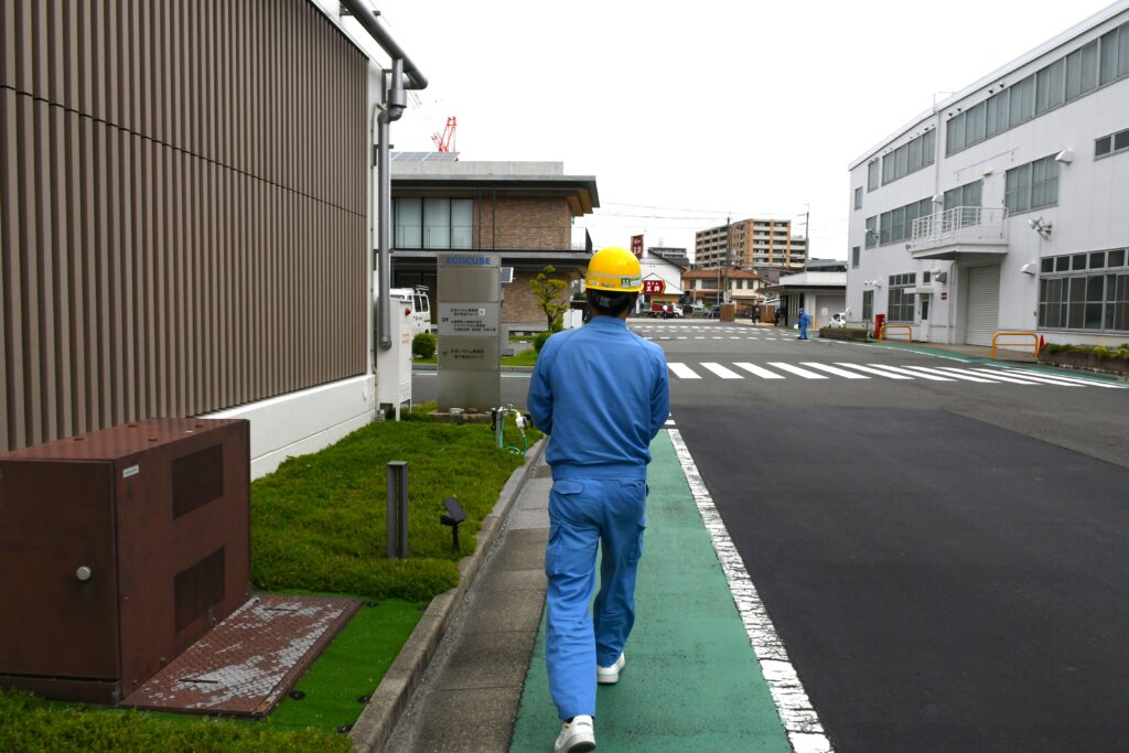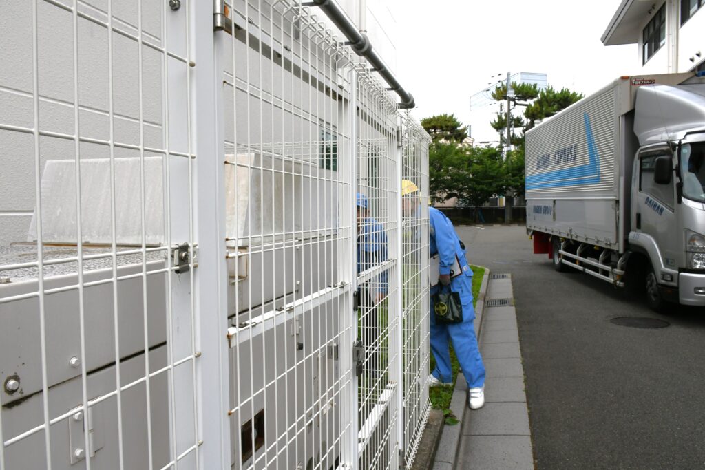 ミーティング後、急いで準備をして敷地内のキュービクルへ。同社には、電気主任技術者の有資格者が50数名いて、事業所ごとに選任されるが、千里丘事業所は広大で受電設備が点在していることから、1名の電気主任技術者と2名の電気主任技術者補佐の合計3名で点検業務を担うという独自のルールがある。