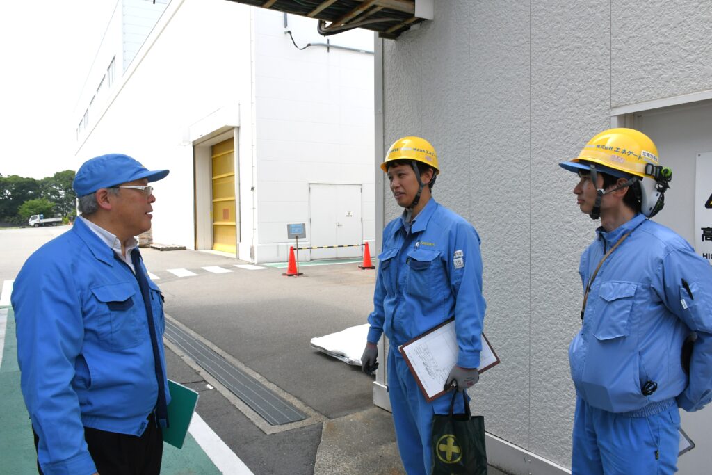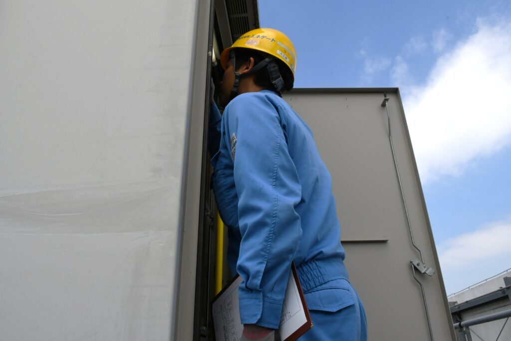 電気主任技術者を務める應田光彦さん、同じく補佐の石原隆明さんと合流し、定期点検業務の準備に取りかかる。